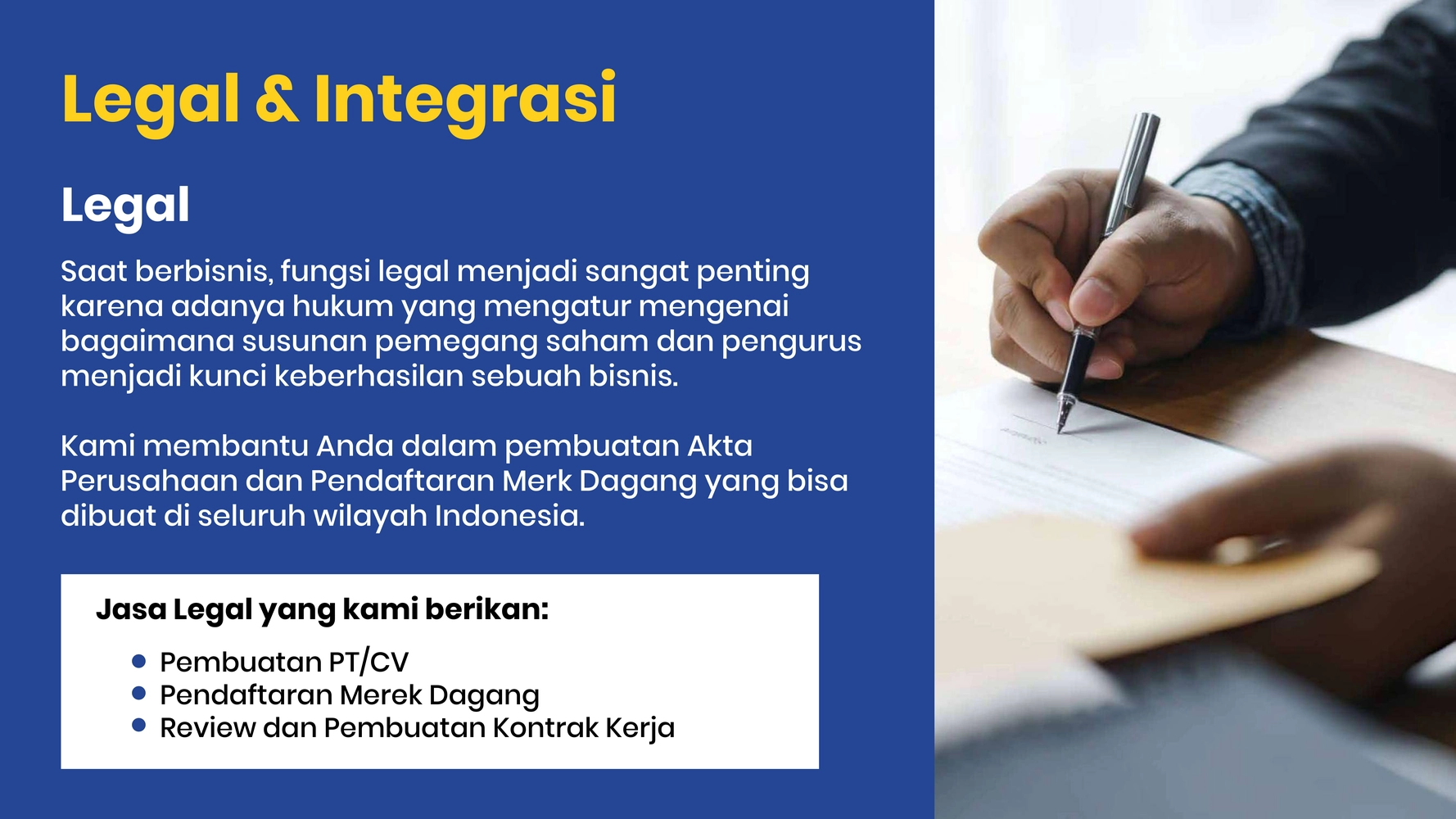 • Membantu mendaftarkan merk dagang milik Klien. Merek dagang adalah jenis kekayaan intelektual berupa nama atau simbol yang diasosiasikan dengan produk atau jasa tertentu.